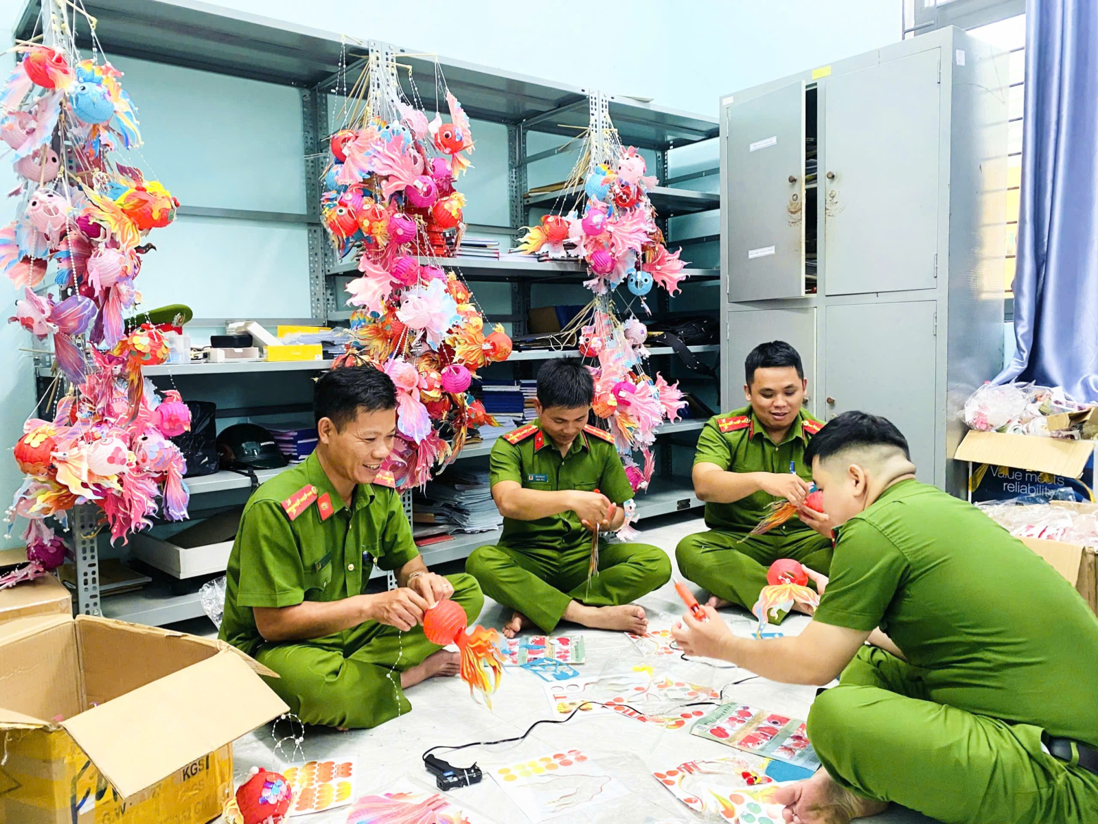 Ngay từ đầu tháng 8 âm lịch, tập thể cán bộ, chiến sĩ Công an xã Bình Hiệp đã tranh thủ thời gian sau giờ làm việc để cùng nhau chuẩn bị nguyên vật liệu, cắt tre, dán giấy, lắp đèn,… Những chiếc lồng đèn truyền thống như đèn ông sao, đèn cá chép,… được làm hoàn toàn thủ công, tỉ mỉ và đầy tâm huyết.